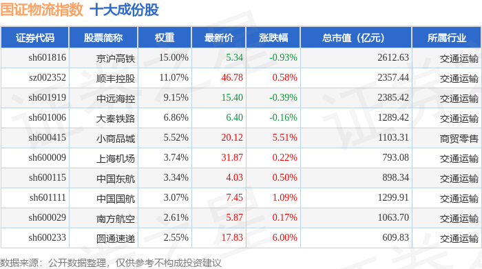 证券之星消息,8月18日,国证物流(399353)指数报收于2165.04点,涨0.61%,成交203.26亿元,换手率0.79%。当日该指数成份股中,上涨的有24家,深圳华强以9.99%的涨幅领涨,下跌的有11家,海油发展以2.73%的跌幅领跌。