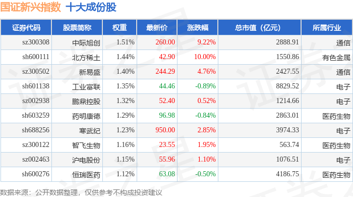 证券之星消息,8月18日,国证新兴(399392)指数报收于2696.11点,涨1.6%,成交3593.79亿元,换手率1.63%。当日该指数成份股中,上涨的有70家,同花顺以10.27%的涨幅领涨,下跌的有25家,中信特钢以3.18%的跌幅领跌。