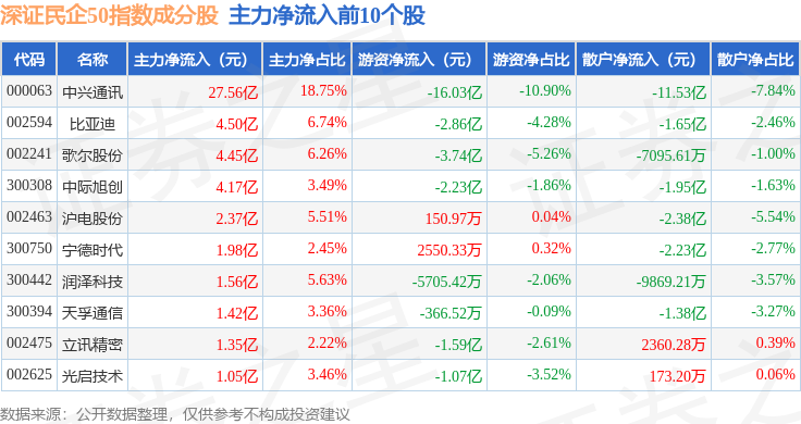 资金流向方面,深证民企50(970057)指数成份股当日主力资金净流入合计32.65亿元,游资资金净流出合计16.94亿元,散户资金净流出合计15.72亿元。成份股资金流向详情见下表: