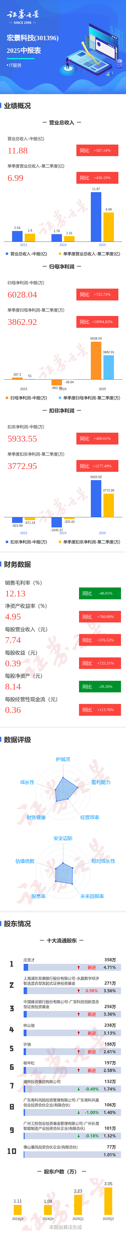 证券之星消息,宏景科技2025年中报显示,公司主营收入11.88亿元,同比上升567.14%;归母净利润6028.04万元,同比上升725.73%;扣非净利润5933.55万元,同比上升460.62%;其中2025年第二季度,公司单季度主营收入6.99亿元,同比上升430.2%;单季度归母净利润3862.92万元,同比上升10094.82%;单季度扣非净利润3772.95万元,同比上升1277.49%;负债率65.22%,投资收益-9.61万元,财务费用1409.78万元,毛利率12.13%。