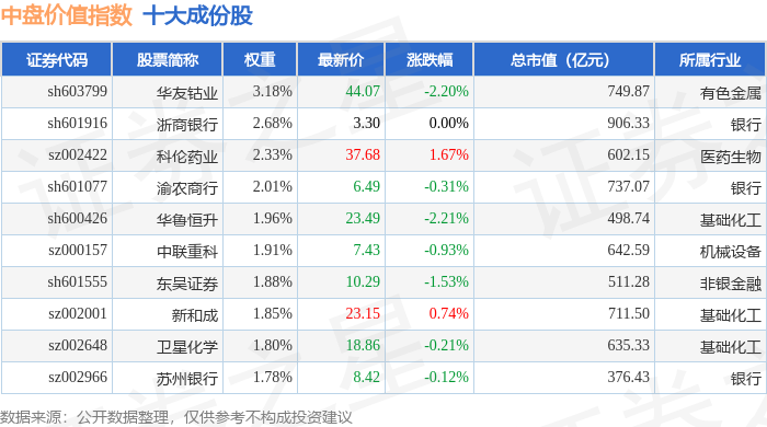 证券之星消息,8月19日,中盘价值(399375)指数报收于5286.74点,跌0.39%,成交530.38亿元,换手率1.2%。当日该指数成份股中,上涨的有31家,长城证券以3.84%的涨幅领涨,下跌的有63家,铜陵有色以3.29%的跌幅领跌。