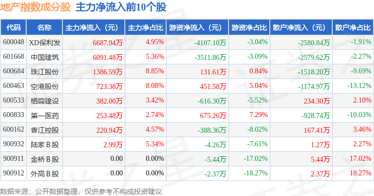资金流向方面,地产指数(000006)成份股当日主力资金净流入合计7742.31万元,游资资金净流出合计5842.08万元,散户资金净流出合计1900.23万元。成份股资金流向详情见下表: