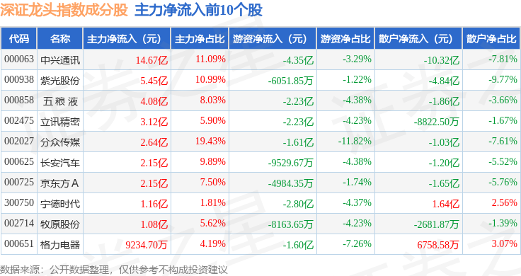 资金流向方面,深证龙头(399653)指数成份股当日主力资金净流入合计5.21亿元,游资资金净流出合计10.87亿元,散户资金净流入合计5.66亿元。成份股资金流向详情见下表: