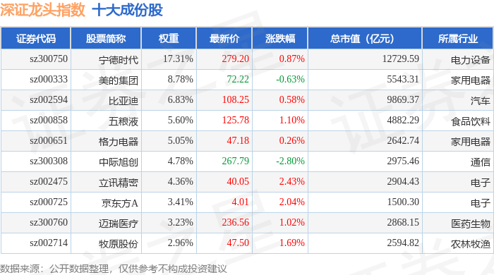 证券之星消息,8月20日,深证龙头(399653)指数报收于2633.95点,涨0.75%,成交1120.75亿元,换手率2.46%。当日该指数成份股中,上涨的有31家,紫光股份以5.76%的涨幅领涨,下跌的有18家,弘业期货以3.7%的跌幅领跌。