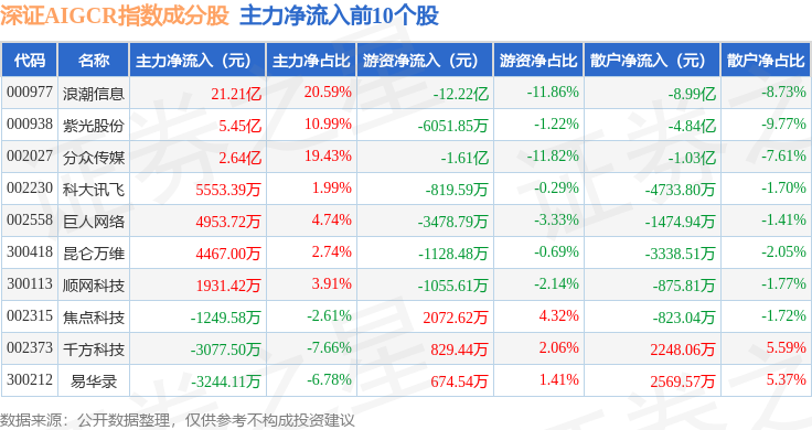 资金流向方面,深证AIGCR(470075)指数成份股当日主力资金净流出合计22.23亿元,游资资金净流出合计2.46亿元,散户资金净流入合计24.69亿元。成份股资金流向详情见下表: