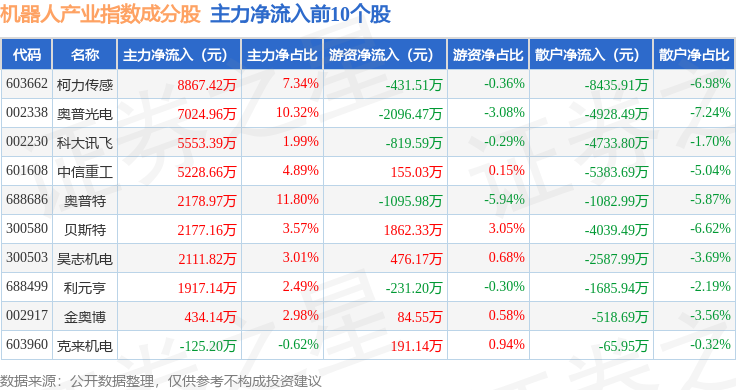 资金流向方面,机器人产业(980022)指数成份股当日主力资金净流出合计21.19亿元,游资资金净流入合计10.79亿元,散户资金净流入合计10.4亿元。成份股资金流向详情见下表: