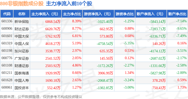 资金流向方面,800非银(399966)指数成份股当日主力资金净流出合计40.68亿元,游资资金净流入合计15.41亿元,散户资金净流入合计25.27亿元。成份股资金流向详情见下表: