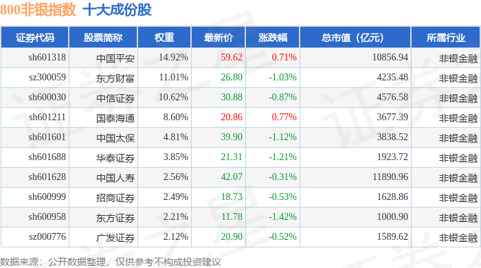 证券之星消息,8月21日,800非银(399966)指数报收于6769.43点,跌0.6%,成交674.83亿元,换手率1.52%。当日该指数成份股中,上涨的有5家,中国人保以1.52%的涨幅领涨,下跌的有45家,长城证券以6.64%的跌幅领跌。