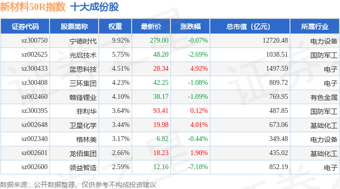 证券之星消息,8月21日,新材料50R(470042)指数报收于3431.79点,跌0.71%,成交630.59亿元,换手率3.74%。当日该指数成份股中,上涨的有13家,横店东磁以4.99%的涨幅领涨,下跌的有37家,领益智造以7.18%的跌幅领跌。