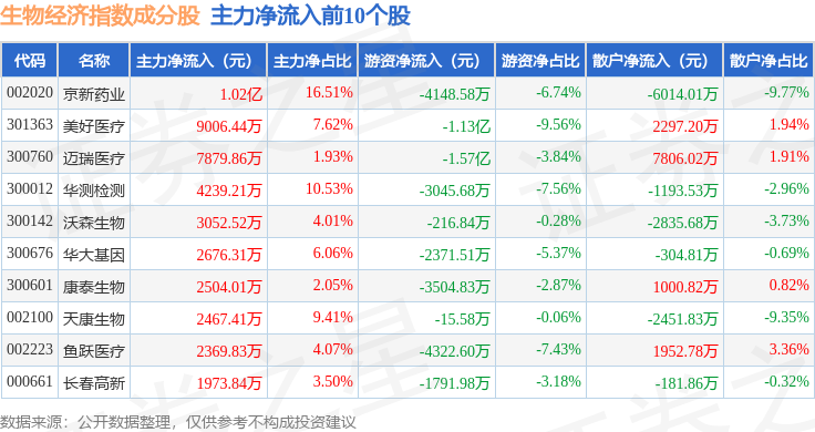 资金流向方面,生物经济(970038)指数成份股当日主力资金净流出合计3.72亿元,游资资金净流出合计2160.8万元,散户资金净流入合计3.94亿元。成份股资金流向详情见下表: