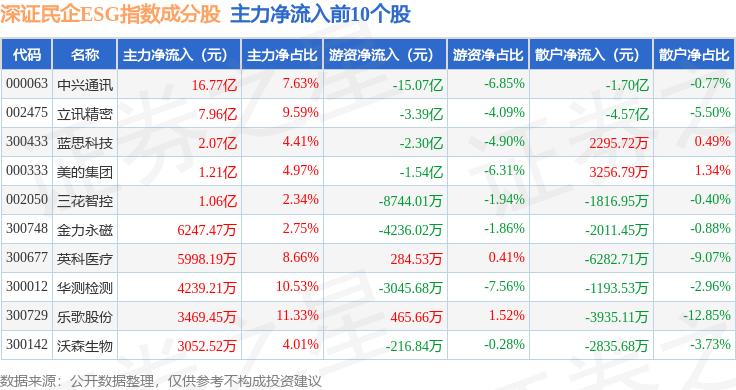 资金流向方面,深证民企ESG(970056)指数成份股当日主力资金净流入合计3.5亿元,游资资金净流出合计15.58亿元,散户资金净流入合计12.07亿元。成份股资金流向详情见下表: