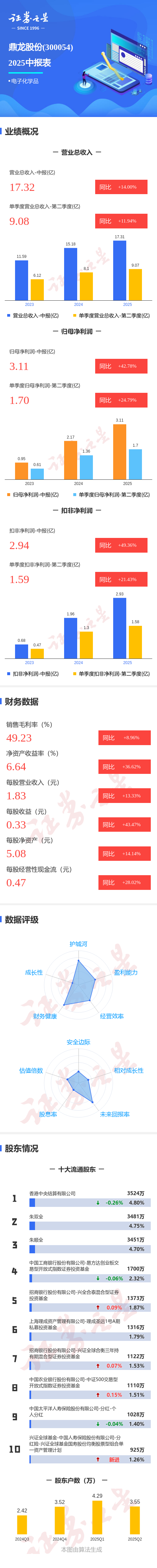 证券之星消息,鼎龙股份2025年中报显示,公司主营收入17.32亿元,同比上升14.0%;归母净利润3.11亿元,同比上升42.78%;扣非净利润2.94亿元,同比上升49.36%;其中2025年第二季度,公司单季度主营收入9.08亿元,同比上升11.94%;单季度归母净利润1.7亿元,同比上升24.79%;单季度扣非净利润1.59亿元,同比上升21.44%;负债率41.63%,投资收益419.92万元,财务费用902.73万元,毛利率49.23%。