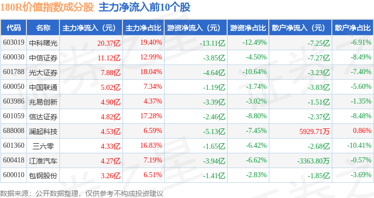 资金流向方面,180R价值(000031)指数成份股当日主力资金净流入合计52.3亿元,游资资金净流出合计47.16亿元,散户资金净流出合计5.15亿元。成份股资金流向详情见下表: