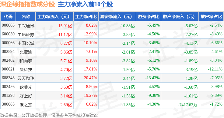 资金流向方面,深企综指(399352)指数成份股当日主力资金净流入合计28.85亿元,游资资金净流出合计46.72亿元,散户资金净流入合计17.88亿元。成份股资金流向详情见下表:
