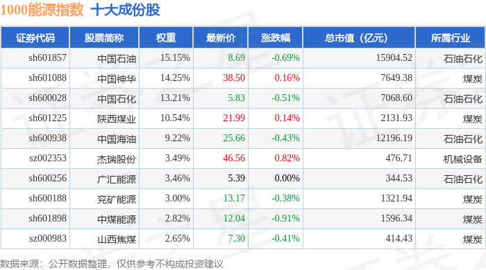 资金流向方面,1000能源(399381)指数成份股当日主力资金净流出合计7.92亿元,游资资金净流入合计1.64亿元,散户资金净流入合计6.28亿元。成份股资金流向详情见下表: