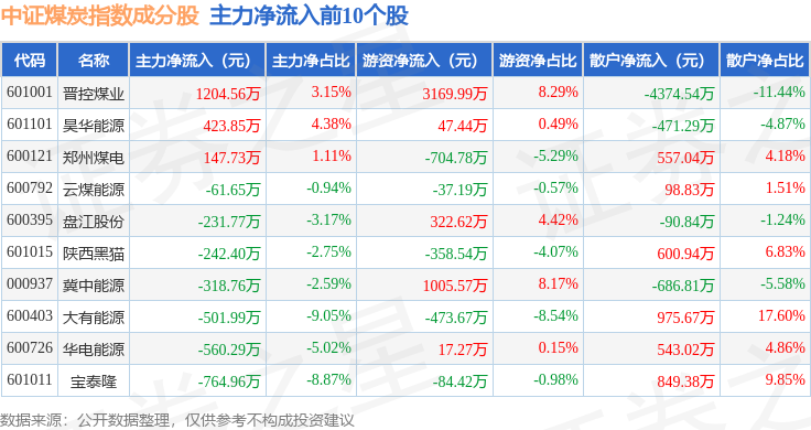 资金流向方面,中证煤炭(399998)指数成份股当日主力资金净流出合计6.18亿元,游资资金净流入合计2.06亿元,散户资金净流入合计4.12亿元。成份股资金流向详情见下表: