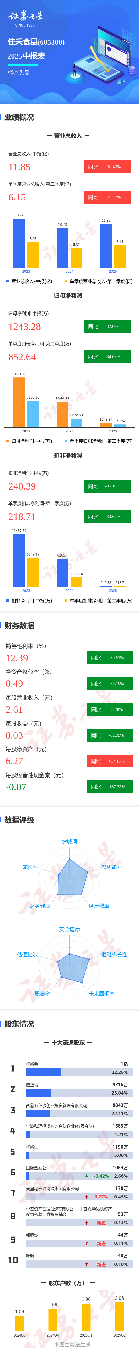 证券之星消息,佳禾食品2025年中报显示,公司主营收入11.85亿元,同比上升10.43%;归母净利润1243.28万元,同比下降82.1%;扣非净利润240.39万元,同比下降96.1%;其中2025年第二季度,公司单季度主营收入6.15亿元,同比上升15.48%;单季度归母净利润852.64万元,同比下降64.06%;单季度扣非净利润218.71万元,同比下降89.67%;负债率17.75%,投资收益-9.12万元,财务费用-157.22万元,毛利率12.39%。