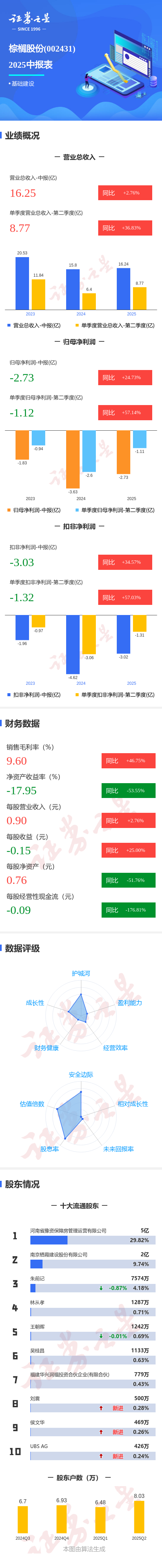 证券之星消息,棕榈股份2025年中报显示,公司主营收入16.25亿元,同比上升2.77%;归母净利润-2.73亿元,同比上升24.73%;扣非净利润-3.03亿元,同比上升34.57%;其中2025年第二季度,公司单季度主营收入8.77亿元,同比上升36.83%;单季度归母净利润-1.12亿元,同比上升57.15%;单季度扣非净利润-1.32亿元,同比上升57.03%;负债率91.53%,投资收益4665.66万元,财务费用2.06亿元,毛利率9.6%。