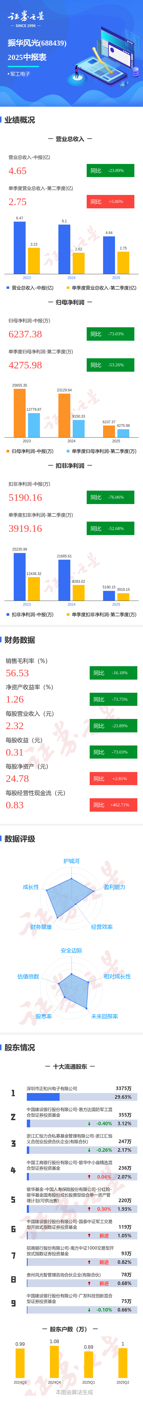 证券之星消息,振华风光2025年中报显示,公司主营收入4.65亿元,同比下降23.9%;归母净利润6237.38万元,同比下降73.03%;扣非净利润5190.16万元,同比下降76.07%;其中2025年第二季度,公司单季度主营收入2.75亿元,同比上升5.07%;单季度归母净利润4275.98万元,同比下降53.27%;单季度扣非净利润3919.16万元,同比下降52.68%;负债率9.31%,投资收益729.09万元,财务费用-13.47万元,毛利率56.53%。