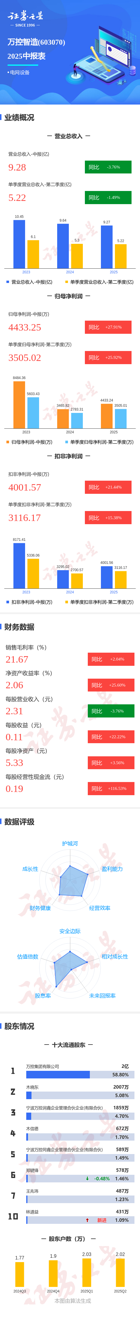 证券之星消息,万控智造2025年中报显示,公司主营收入9.28亿元,同比下降3.76%;归母净利润4433.25万元,同比上升27.91%;扣非净利润4001.57万元,同比上升21.44%;其中2025年第二季度,公司单季度主营收入5.22亿元,同比下降1.5%;单季度归母净利润3505.02万元,同比上升25.93%;单季度扣非净利润3116.17万元,同比上升15.39%;负债率27.71%,投资收益26.09万元,财务费用-621.11万元,毛利率21.67%。