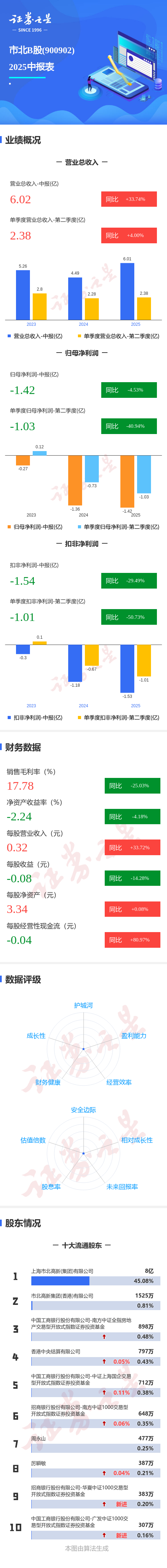 证券之星消息,市北B股2025年中报显示,公司主营收入6.02亿元,同比上升33.75%;归母净利润-1.42亿元,同比下降4.53%;扣非净利润-1.54亿元,同比下降29.5%;其中2025年第二季度,公司单季度主营收入2.38亿元,同比上升4.01%;单季度归母净利润-1.03亿元,同比下降40.95%;单季度扣非净利润-1.01亿元,同比下降50.73%;负债率60.18%,投资收益-206.7万元,财务费用1.32亿元,毛利率17.78%。