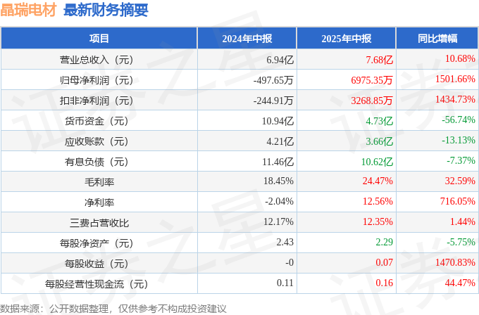 据证券之星公开数据整理,近期晶瑞电材(300655)发布2025年中报。截至本报告期末,公司营业总收入7.68亿元,同比上升10.68%,归母净利润6975.35万元,同比上升1501.66%。按单季度数据看,第二季度营业总收入3.98亿元,同比上升9.33%,第二季度归母净利润2625.09万元,同比上升548.79%。本报告期晶瑞电材盈利能力上升,毛利率同比增幅32.59%,净利率同比增幅716.05%。