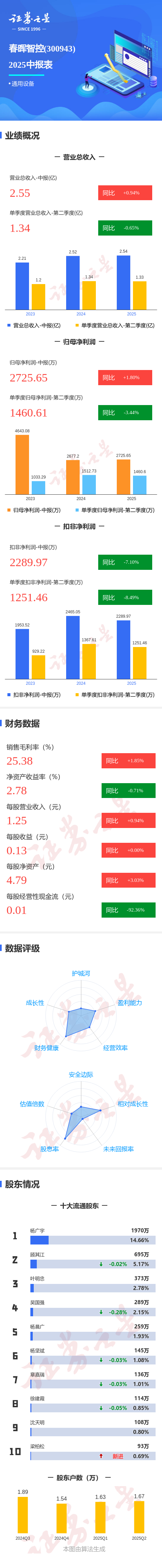 证券之星消息,春晖智控2025年中报显示,公司主营收入2.55亿元,同比上升0.95%;归母净利润2725.65万元,同比上升1.81%;扣非净利润2289.97万元,同比下降7.1%;其中2025年第二季度,公司单季度主营收入1.34亿元,同比下降0.66%;单季度归母净利润1460.61万元,同比下降3.45%;单季度扣非净利润1251.46万元,同比下降8.49%;负债率20.11%,投资收益873.23万元,财务费用-123.6万元,毛利率25.38%。