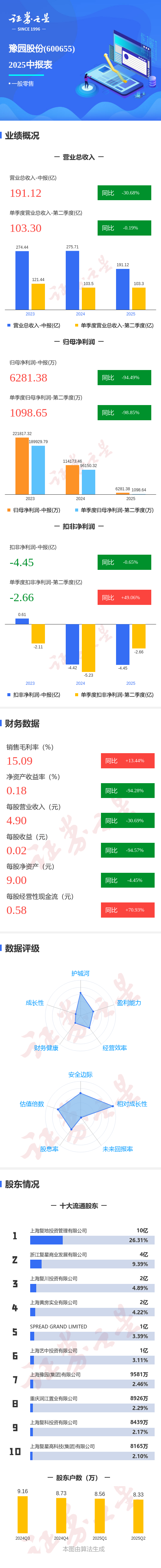 证券之星消息,豫园股份2025年中报显示,公司主营收入191.12亿元,同比下降30.68%;归母净利润6281.38万元,同比下降94.5%;扣非净利润-4.45亿元,同比下降0.66%;其中2025年第二季度,公司单季度主营收入103.3亿元,同比下降0.2%;单季度归母净利润1098.65万元,同比下降98.86%;单季度扣非净利润-2.66亿元,同比上升49.06%;负债率68.18%,投资收益2.79亿元,财务费用8.23亿元,毛利率15.09%。