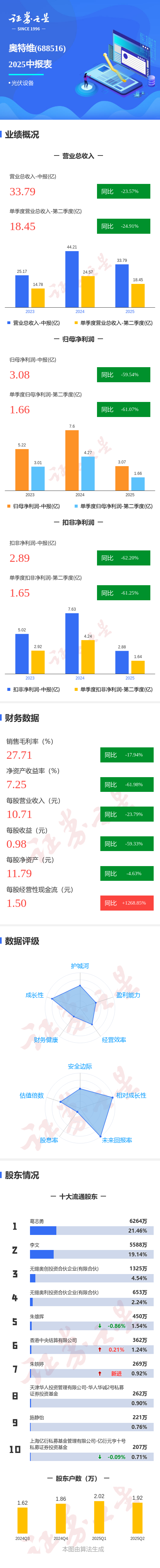 证券之星消息,奥特维2025年中报显示,公司主营收入33.79亿元,同比下降23.57%;归母净利润3.08亿元,同比下降59.54%;扣非净利润2.89亿元,同比下降62.21%;其中2025年第二季度,公司单季度主营收入18.45亿元,同比下降24.91%;单季度归母净利润1.66亿元,同比下降61.08%;单季度扣非净利润1.65亿元,同比下降61.26%;负债率72.7%,投资收益1213.8万元,财务费用2230.67万元,毛利率27.71%。