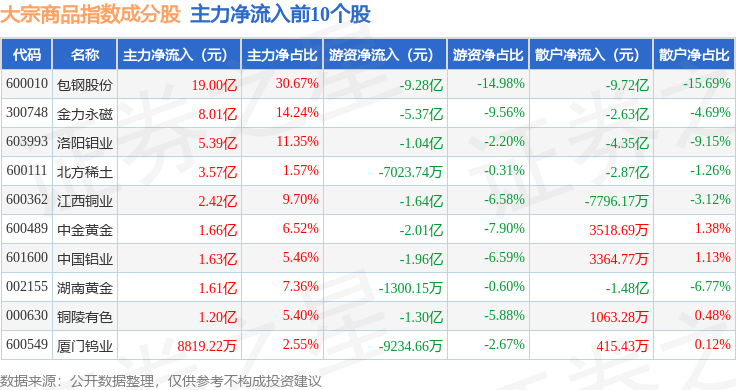 资金流向方面,大宗商品(000979)指数成份股当日主力资金净流入合计33.77亿元,游资资金净流出合计27.39亿元,散户资金净流出合计6.38亿元。成份股资金流向详情见下表: