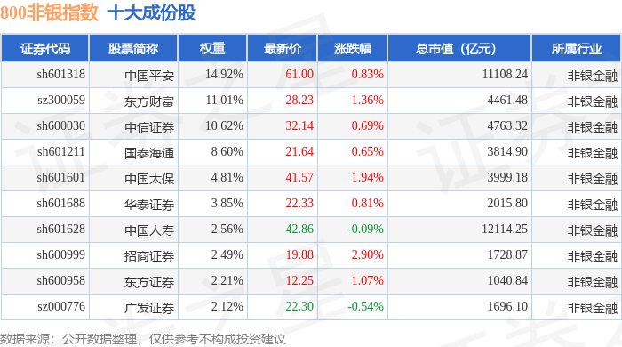 证券之星消息,8月25日,800非银(399966)指数报收于7030.37点,涨0.88%,成交1218.55亿元,换手率2.56%。当日该指数成份股中,上涨的有39家,湘财股份以7.76%的涨幅领涨,下跌的有10家,中银证券以1.03%的跌幅领跌。