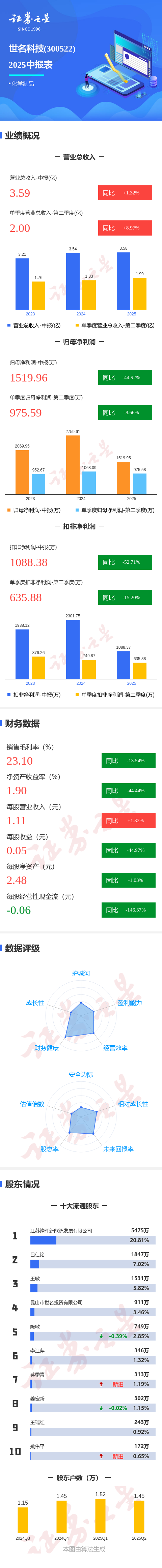 证券之星消息,世名科技2025年中报显示,公司主营收入3.59亿元,同比上升1.33%;归母净利润1519.96万元,同比下降44.92%;扣非净利润1088.38万元,同比下降52.72%;其中2025年第二季度,公司单季度主营收入2.0亿元,同比上升8.98%;单季度归母净利润975.59万元,同比下降8.66%;单季度扣非净利润635.88万元,同比下降15.2%;负债率27.02%,投资收益-99.42万元,财务费用131.11万元,毛利率23.1%。