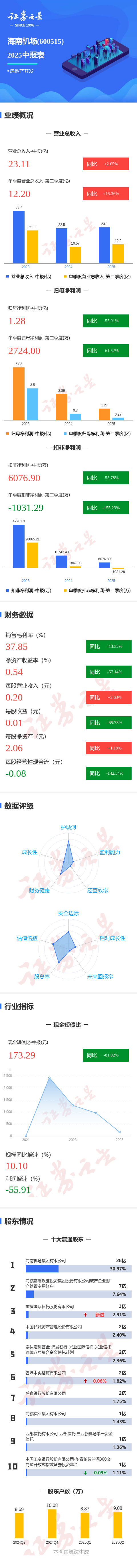 证券之星消息,海南机场2025年中报显示,公司主营收入23.11亿元,同比上升2.66%;归母净利润1.28亿元,同比下降55.91%;扣非净利润6076.9万元,同比下降55.78%;其中2025年第二季度,公司单季度主营收入12.2亿元,同比上升15.36%;单季度归母净利润2724.0万元,同比下降61.52%;单季度扣非净利润-1031.29万元,同比下降155.24%;负债率51.39%,投资收益-1126.77万元,财务费用2.44亿元,毛利率37.85%。