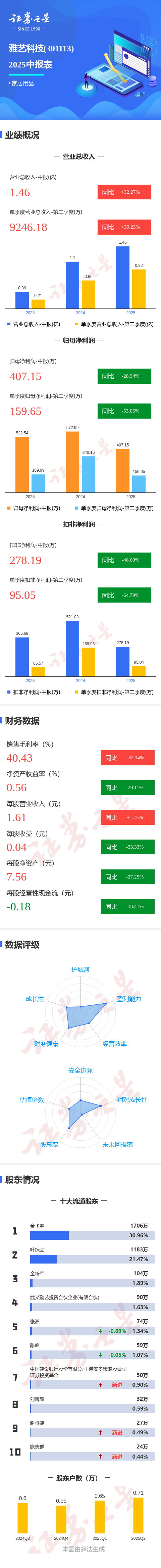 证券之星消息,雅艺科技2025年中报显示,公司主营收入1.46亿元,同比上升32.28%;归母净利润407.15万元,同比下降28.94%;扣非净利润278.19万元,同比下降46.61%;其中2025年第二季度,公司单季度主营收入9246.18万元,同比上升39.23%;单季度归母净利润159.65万元,同比下降53.07%;单季度扣非净利润95.05万元,同比下降64.79%;负债率6.69%,投资收益103.34万元,财务费用-166.43万元,毛利率40.43%。