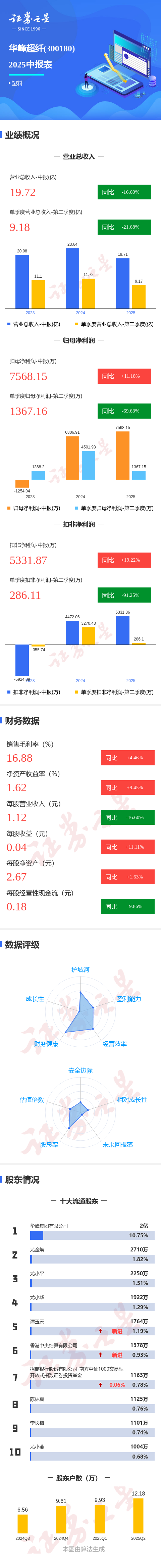 证券之星消息,华峰超纤2025年中报显示,公司主营收入19.72亿元,同比下降16.61%;归母净利润7568.15万元,同比上升11.18%;扣非净利润5331.87万元,同比上升19.23%;其中2025年第二季度,公司单季度主营收入9.18亿元,同比下降21.69%;单季度归母净利润1367.16万元,同比下降69.63%;单季度扣非净利润286.11万元,同比下降91.25%;负债率28.52%,投资收益260.48万元,财务费用541.97万元,毛利率16.88%。
