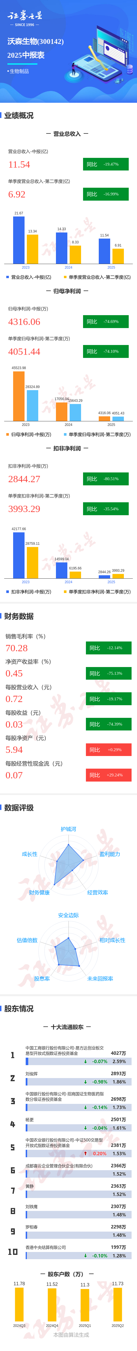 证券之星消息,沃森生物2025年中报显示,公司主营收入11.54亿元,同比下降19.47%;归母净利润4316.06万元,同比下降74.69%;扣非净利润2844.27万元,同比下降80.52%;其中2025年第二季度,公司单季度主营收入6.92亿元,同比下降16.99%;单季度归母净利润4051.44万元,同比下降74.1%;单季度扣非净利润3993.29万元,同比下降35.55%;负债率23.11%,投资收益-48.61万元,财务费用-4449.97万元,毛利率70.28%。