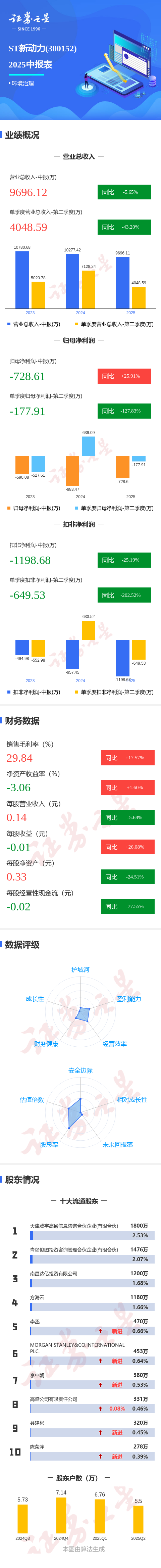 证券之星消息,ST新动力2025年中报显示,公司主营收入9696.12万元,同比下降5.66%;归母净利润-728.61万元,同比上升25.91%;扣非净利润-1198.68万元,同比下降25.19%;其中2025年第二季度,公司单季度主营收入4048.59万元,同比下降43.2%;单季度归母净利润-177.91万元,同比下降127.84%;单季度扣非净利润-649.53万元,同比下降202.53%;负债率68.44%,投资收益-234.0万元,财务费用180.19万元,毛利率29.84%。