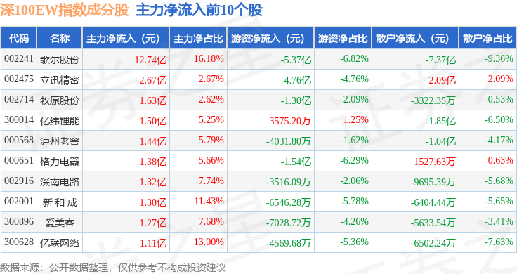 资金流向方面,深100EW(399632)指数成份股当日主力资金净流出合计76.58亿元,游资资金净流入合计8.69亿元,散户资金净流入合计67.89亿元。成份股资金流向详情见下表: