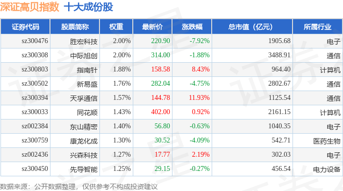 证券之星消息,8月26日,深证高贝(399662)指数报收于2120.9点,涨0.4%,成交2848.76亿元,换手率4.49%。当日该指数成份股中,上涨的有47家,天孚通信以11.93%的涨幅领涨,下跌的有52家,胜宏科技以7.92%的跌幅领跌。