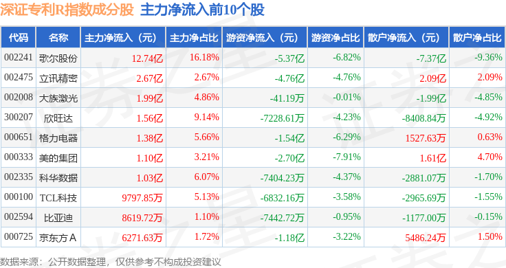 资金流向方面,深证专利R(470067)指数成份股当日主力资金净流出合计17.37亿元,游资资金净流出合计6.52亿元,散户资金净流入合计23.89亿元。成份股资金流向详情见下表: