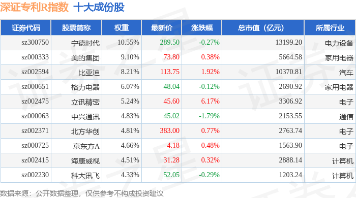 深证专利R(470067)指数十大成份股详情如下: