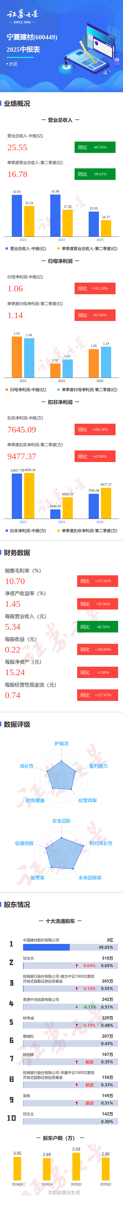 证券之星消息,宁夏建材2025年中报显示,公司主营收入25.55亿元,同比下降40.56%;归母净利润1.06亿元,同比上升101.24%;扣非净利润7645.09万元,同比上升168.35%;其中2025年第二季度,公司单季度主营收入16.78亿元,同比下降38.61%;单季度归母净利润1.14亿元,同比上升67.8%;单季度扣非净利润9477.37万元,同比上升43.98%;负债率26.62%,投资收益2239.12万元,财务费用215.65万元,毛利率10.7%。