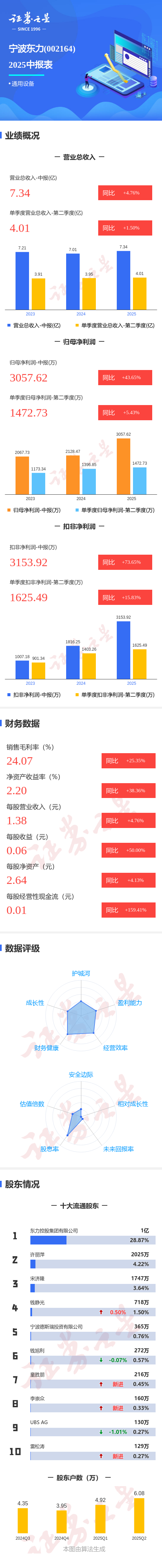 证券之星消息,宁波东力2025年中报显示,公司主营收入7.34亿元,同比上升4.77%;归母净利润3057.62万元,同比上升43.65%;扣非净利润3153.92万元,同比上升73.65%;其中2025年第二季度,公司单季度主营收入4.01亿元,同比上升1.51%;单季度归母净利润1472.73万元,同比上升5.43%;单季度扣非净利润1625.49万元,同比上升15.84%;负债率43.08%,投资收益114.17万元,财务费用528.81万元,毛利率24.07%。