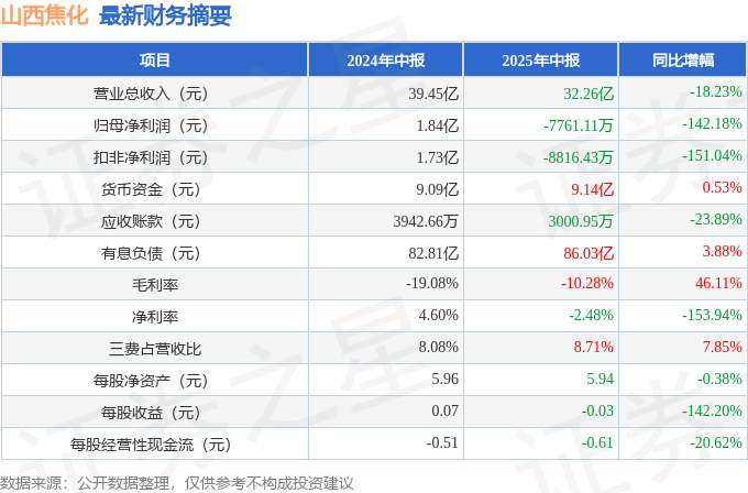 据证券之星公开数据整理,近期山西焦化(600740)发布2025年中报。根据财报显示,山西焦化净利润同比下降142.18%。截至本报告期末,公司营业总收入32.26亿元,同比下降18.23%,归母净利润-7761.11万元,同比下降142.18%。按单季度数据看,第二季度营业总收入15.44亿元,同比下降27.29%,第二季度归母净利润-735.2万元,同比下降106.22%。