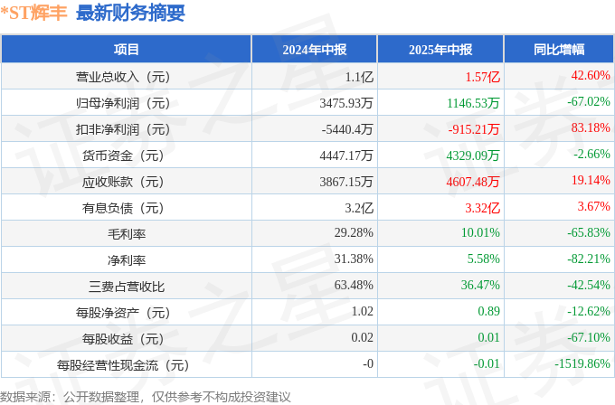 据证券之星公开数据整理,近期*ST辉丰(002496)发布2025年中报。根据财报显示,*ST辉丰增收不增利。截至本报告期末,公司营业总收入1.57亿元,同比上升42.6%,归母净利润1146.53万元,同比下降67.02%。按单季度数据看,第二季度营业总收入8299.98万元,同比上升56.91%,第二季度归母净利润-419.28万元,同比上升69.21%。