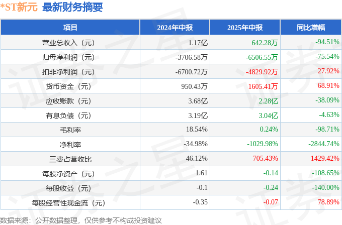 据证券之星公开数据整理,近期*ST新元(300472)发布2025年中报。截至本报告期末,公司营业总收入642.28万元,同比下降94.51%,归母净利润-6506.55万元,同比下降75.54%。按单季度数据看,第二季度营业总收入261.45万元,同比下降94.14%,第二季度归母净利润-4783.71万元,同比下降108.78%。本报告期*ST新元三费占比上升明显,财务费用、销售费用和管理费用总和占总营收同比增幅达2782.27%。