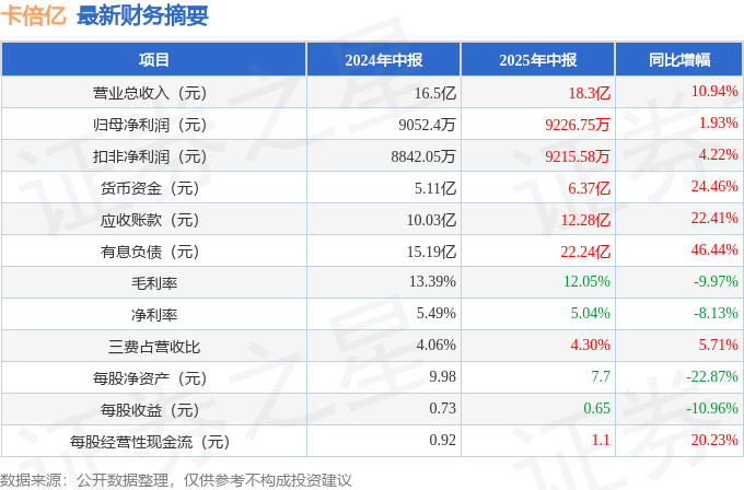 据证券之星公开数据整理,近期卡倍亿(300863)发布2025年中报。截至本报告期末,公司营业总收入18.3亿元,同比上升10.94%,归母净利润9226.75万元,同比上升1.93%。按单季度数据看,第二季度营业总收入9.46亿元,同比上升8.48%,第二季度归母净利润3913.97万元,同比下降15.58%。本报告期卡倍亿公司应收账款体量较大,当期应收账款占最新年报归母净利润比达759.49%。