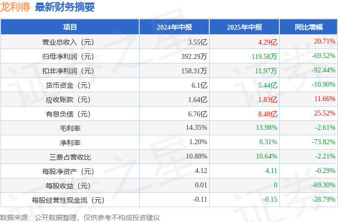 据证券之星公开数据整理,近期龙利得(300883)发布2025年中报。根据财报显示,龙利得增收不增利。截至本报告期末,公司营业总收入4.29亿元,同比上升20.71%,归母净利润119.58万元,同比下降69.52%。按单季度数据看,第二季度营业总收入2.23亿元,同比上升20.26%,第二季度归母净利润-55.66万元,同比上升55.43%。