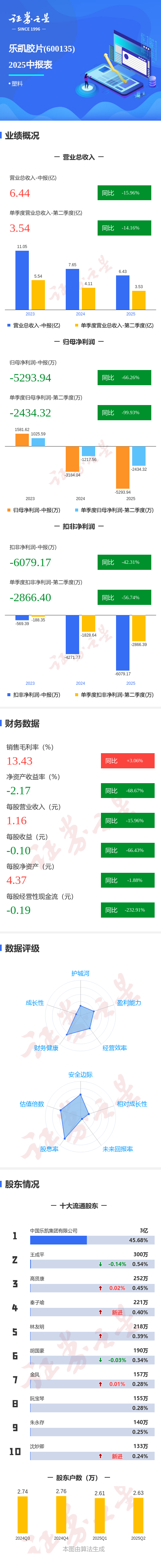 证券之星消息,乐凯胶片2025年中报显示,公司主营收入6.44亿元,同比下降15.97%;归母净利润-5293.94万元,同比下降66.26%;扣非净利润-6079.17万元,同比下降42.31%;其中2025年第二季度,公司单季度主营收入3.54亿元,同比下降14.16%;单季度归母净利润-2434.32万元,同比下降99.93%;单季度扣非净利润-2866.4万元,同比下降56.75%;负债率11.74%,投资收益130.18万元,财务费用-494.66万元,毛利率13.43%。