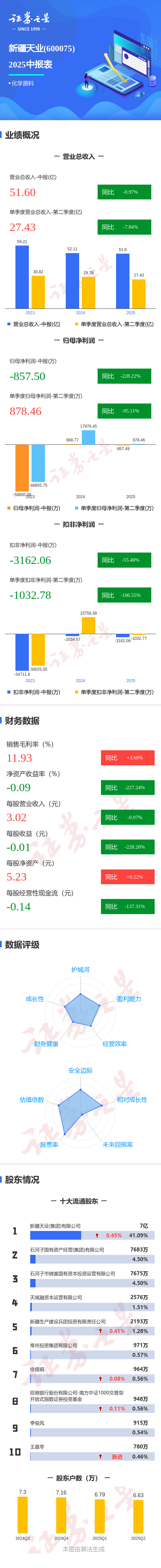 证券之星消息,新疆天业2025年中报显示,公司主营收入51.6亿元,同比下降0.98%;归母净利润-857.5万元,同比下降228.22%;扣非净利润-3162.06万元,同比下降55.41%;其中2025年第二季度,公司单季度主营收入27.43亿元,同比下降7.84%;单季度归母净利润878.46万元,同比下降95.11%;单季度扣非净利润-1032.78万元,同比下降106.55%;负债率55.28%,投资收益3109.86万元,财务费用1.15亿元,毛利率11.93%。